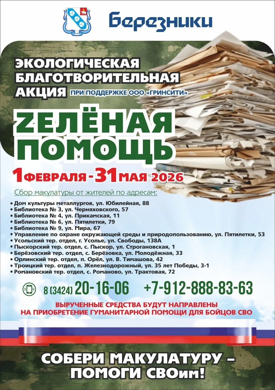 С каждого собранного килограмма макулатуры 4 рубля будут направлены в МОО «Союз ветеранов боевых действий» г. Березники для дальнейшей закупки гуманитарной помощи для нужд СВО.