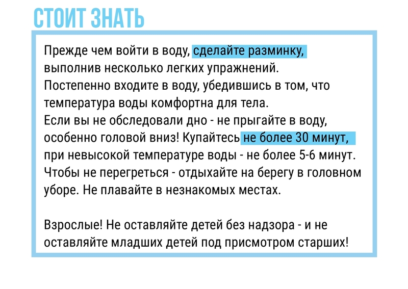 Лето на исходе, но помнить о безопасности необходимо в любое время года. Мы предлагаем вспомнить несколько правил поведения на воде (они могут пригодиться даже в бассейне!) и напоминаем несколько рекомендаций по поведению при возгорании