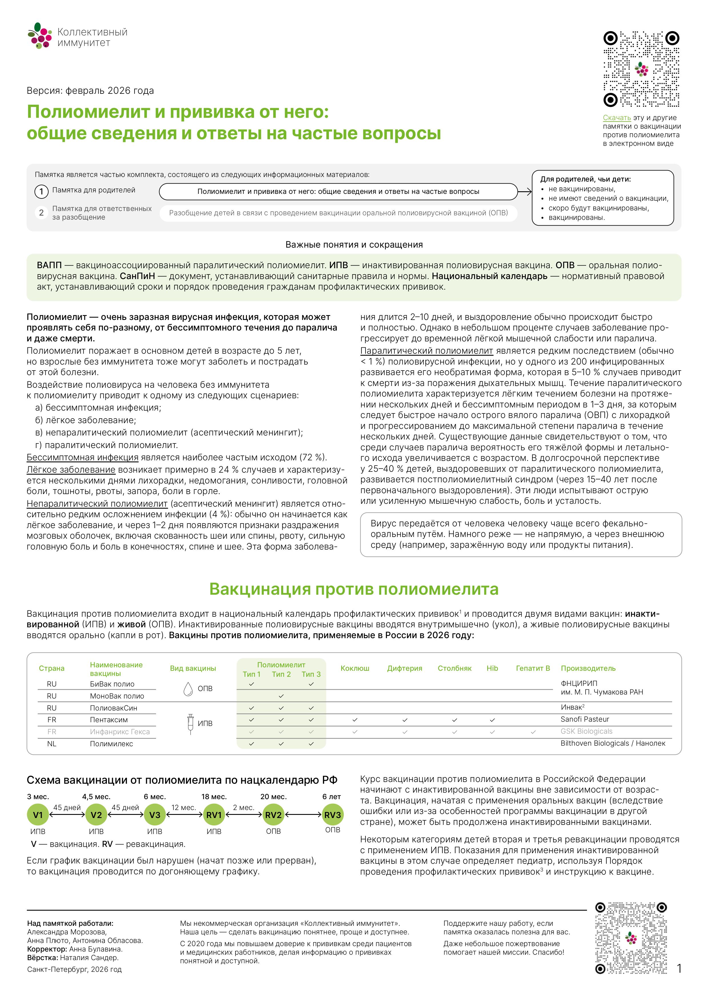 Вакцинация против полиомиелита входит в национальный календарь профилактических прививок и проводится двумя видами вакцин: инактивированной (ИПВ) и живой (ОПВ). Инактивированные полиовирусные вакцины вводятся внутримышечно (укол), а живые полиовирусные вакцины вводятся орально (капли в рот).