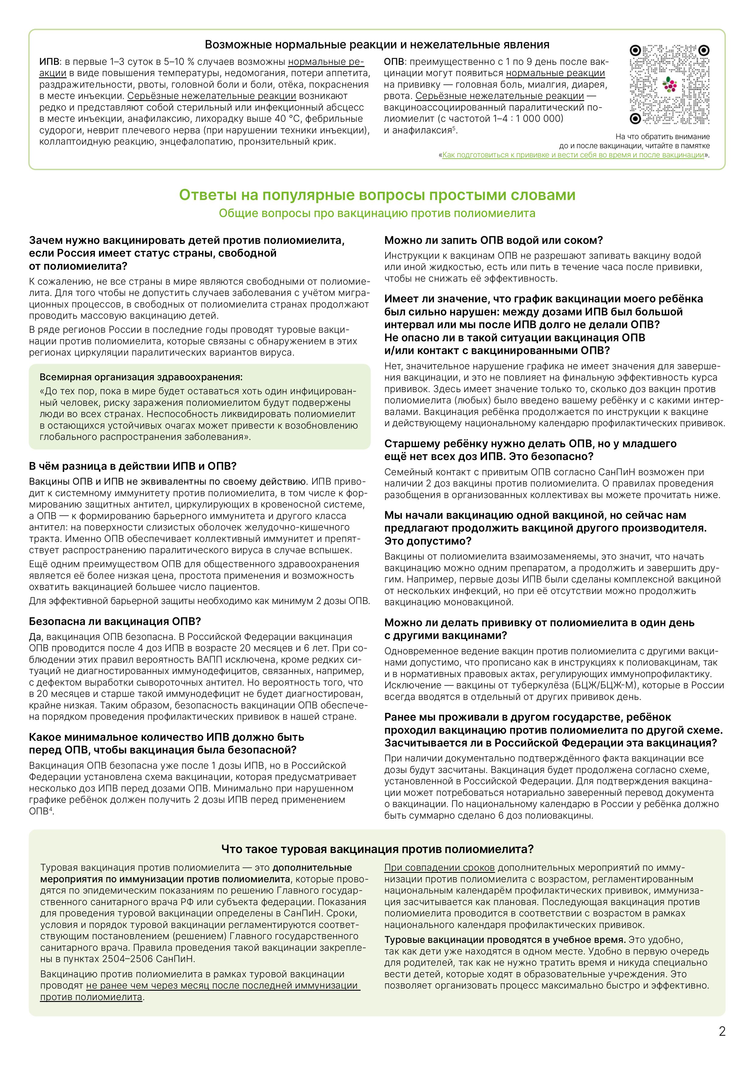 Россия имеет статус страны, свободной от полиомиелита, но не все страны в мире являются свободными от полиомиелита. Для того чтобы не допустить случаев заболевания с учётом миграционных процессов, в свободных от полиомиелита странах продолжают проводить массовую вакцинацию детей.