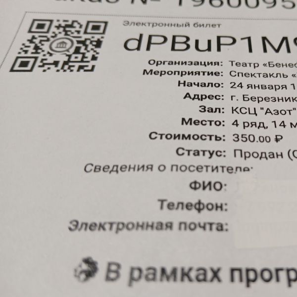 Когда вы покупаете билет на спектакль по Пушкинской карте, вам на электронную почту приходит билет со сведениями о дате и времени спектакля, вашими данными... но главное - с QR-кодом. Именно его и нужно предъявить на входе в зрительный зал! Найдите его в своей почте прежде чем пройти контроль - это сбережёт ваше время!