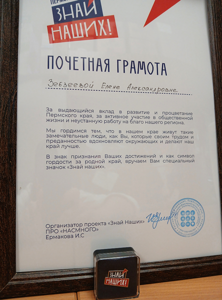 И мы рады сообщить, что в число награждённых почётным знаком «Знай наших» вошла художественный руководитель театра «Бенефис» Елена Александровна Зебзеева! Организаторы премии отметили плодотворную работу Елены Александровны по сохранению классического театрального искусства, активное участие в культурной жизни города Березники и Пермского края, творческую самоотдачу и мастерство режиссера.
